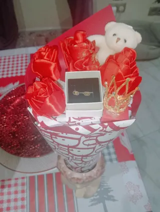 Precioso arreglo floral con detalles románticos. - Flores rojas frescas. - Globo en forma de corazón con mensaje. - Chocolates Ferrero Rocher. - Peluche de oso blanco.