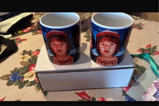 Taza blanca con un diseño personalizado de una niña y estrellas rojas. - Incluye un pequeño osito de peluche. - Adornada con flores. - Presentada sobre una base de rodajas de madera.