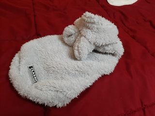 Abrigo de peluche, muy suave, blandito y cómodo, para perritos medianitos. Con dos orejitas en el gorrito. Color beige. Sin estrenar, le quedó grande a mi yorkshire. Talla XL