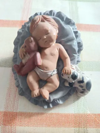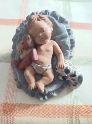 Preciosa figura de un niño Jesús durmiendo, ideal para coleccionistas o decoración navideña. - Estilo vintage de los años 70. - Incluye un osito de peluche y un perrito. - Base con forma de almohada.