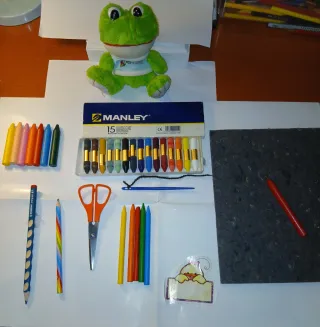 Fui maestra de infantil y aún conservo algún material que compré para desarrollar mi trabajo. También suele ser material que se pide en las escuelas infantiles: Ceras blandas Manley [15], ceras blandas Dacs [7], ceras plastidecor [5], tijeras infantiles, lápiz grueso, lápiz multicolor, punzón infantil y alfombrilla, aguja de plástico para cosidos infantiles, rulo para pintar. Regalo peluche, que es otro parecido al de la foto.
