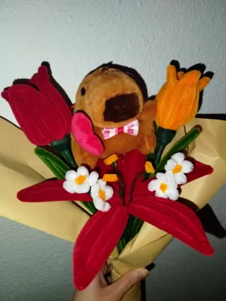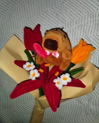 Reto de tiktok: haciendo ramos de Pinterest a nuestro estilo Parte 3 Tiktok de Floraria: @floraria_studio Se pone en venta este ejemplar del reto, para conseguir más clientes y visualizaciones✨ Este ramo tiene temática de San Valentín, para aquellos que buscan un ramo para regalar 1 lirio rojo, 1 tulipán rojo y otro naranja, y dos tallos de margaritas blancas, envueltos en papel de color marrón (este envoltorio es de muestra), y un peluche de capibara con pajarita y un corazón Para ver el catálogo busca alguna de nuestras redes sociales: - Vinted: florariastudio - Instagram: floraria_studio - Tiktok: floraria_studio