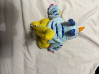 Peluche de un personaje de Digimon. - Color azul claro y amarillo. - Nariz naranja. - Ojos con detalles rojos y negros.