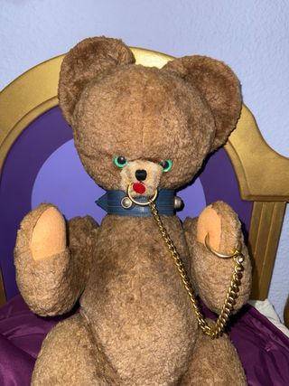 Este oso de peluche vintage tiene un aspecto único y llamativo. Es un artículo de colección interesante. - Color marrón. - Collar azul con cadena. - Ojos verdes y nariz roja.