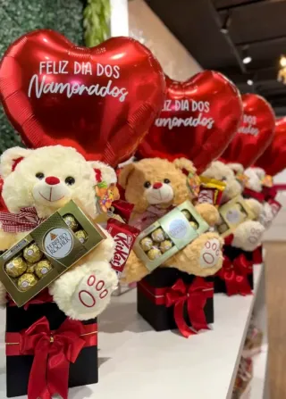 Detalle especial para el Día de los Enamorados. - Peluche de oso. - Caja de chocolates Ferrero Rocher. - Globo con forma de corazón. - Presentación en caja negra con lazo rojo.