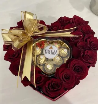 Preciosa cajita de regalo lista para sorprender. Contiene un tierno peluche, decorada con rosas rojas y chocolates. - Peluche de oso. - Decoración con rosas eternas. - Chocolates Ferrero Rocher.