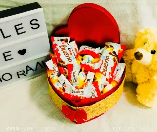 Precioso detalle en forma de corazón, perfecto para sorprender. Contiene una selección de chocolates Kinder y un tierno peluche de oso. - Caja en forma de corazón. - Chocolates Kinder Bueno y Kinder Sorpresa. - Peluche de oso amarillo.