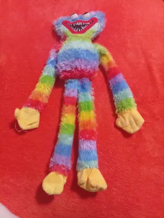 Peluche suave y colorido con diseño de arcoíris. - Cuerpo y extremidades a rayas de colores. - Manos y pies de color amarillo. - Cara con dientes y sonrisa llamativa.