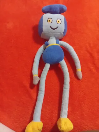 Peluche de personaje con diseño divertido y llamativo. - Cuerpo y cabeza de tela azul y celeste. - Brazos y piernas largas y delgadas. - Detalles en amarillo en pies y muñecas. - Cara sonriente con ojos amarillos.