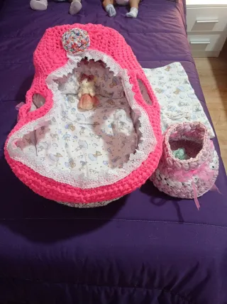 Precioso moisés tejido a mano en color rosa, perfecto para los más pequeños. Incluye un dulce osito de peluche y un conjunto de patucos a juego. - Tejido exterior de punto grueso en color rosa. - Forro interior con estampado de nubes y ositos. - Adorno de encaje blanco en el borde. - Incluye un osito de peluche. - Conjunto de patucos tejidos a juego. Especial para reborn 30€