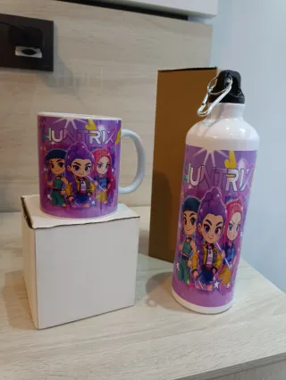 Pack de taza y botella de agua 750 ml acero inoxidable con diseño de Huntrix. - Taza con asa. - Botella de aluminio con mosquetón.