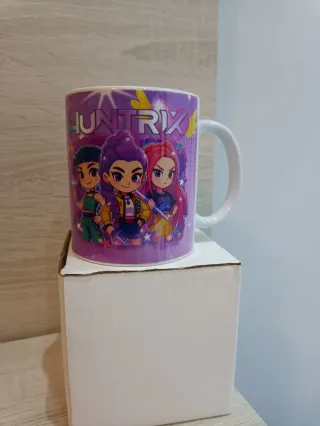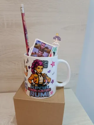 Taza con diseño inspirado en Huntrix y estética K-pop. - Ilustración vibrante de personajes. - Ideal para fans de la serie y la música. - Apta para bebidas calientes y frías.