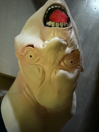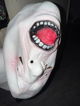 Máscara de látex con un diseño de cara invertida y expresión de grito. - Material: Látex - Color: Blanco - Boca abierta con dientes blancos y lengua roja - Ojos negros - Nariz y orejas detalladas
