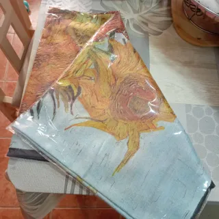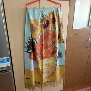 Pañuelo de mujer con un vibrante diseño de girasoles, inspirado en la obra de Van Gogh. Ideal para añadir un toque artístico a tu estilo. - Diseño de girasoles. - Colores cálidos y vivos. - Tejido suave al tacto.