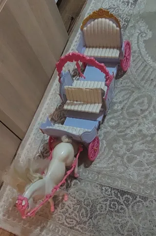 Set de carroza y caballo de juguete. - Carroza de color lila y rosa con asientos. - Caballo blanco con crin rubia. - Ruedas rosas en la carroza.