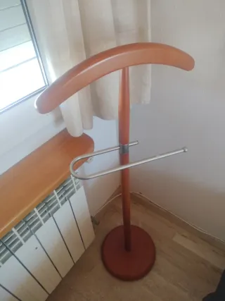 Elegante perchero de pie con base redonda. - Estructura principal de madera. - Barra para colgar ropa de metal. - Diseño moderno y funcional.
