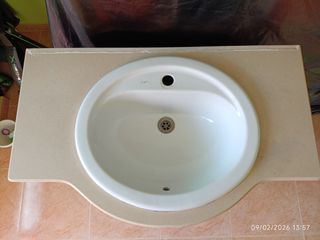 Mueble de baño con un diseño moderno y funcional. Mueble de baño con encimera color beige y lavamanos, gran espacio para almacenamiento