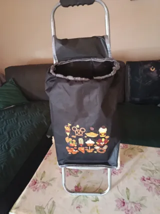 Carrito de la compra con un diseño alegre y llamativo.Solo 2 ,veces utilizado. Como nuevo.Ideal nen@s, para ayudar a mamá. .Con correa para cerrarlo.Mide 80cm de alto y 20cm de ancho. - Estructura metálica. - Bolsa de tela negra con estampado de comida y personajes. - Ruedas para facilitar el transporte.