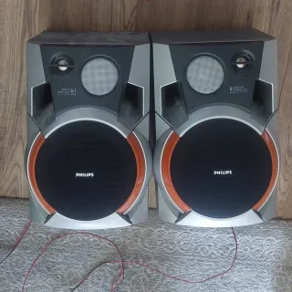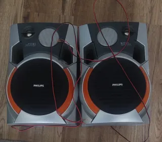 Pareja de altavoces Philips con tecnología Bass Reflex. - Diseño moderno en color negro, gris y naranja. - Marca: Philips. - Modelo: Bass Reflex Speaker System.