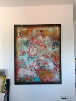 Lienzo grande con un diseño de arte abstracto estilo graffiti. - Colores vibrantes y formas dinámicas. - Técnica mixta con spray y otros materiales. Medidas: 116x90 cm