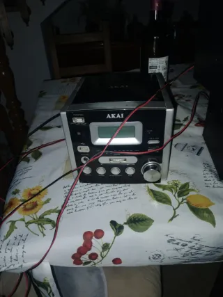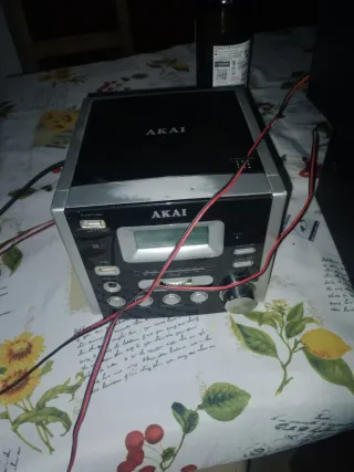 Aparato de radio de la marca AKAI. - Diseño compacto y moderno. - Panel frontal con pantalla y controles. - Conexiones USB y para auriculares.