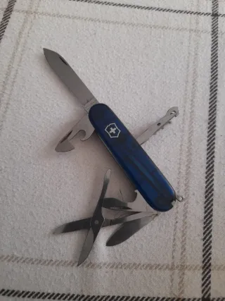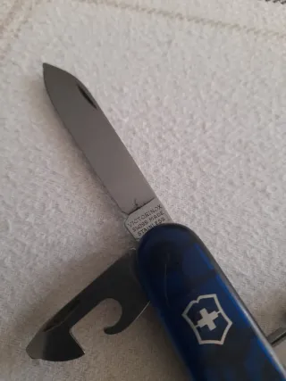 Navaja multiusos Victorinox con mango de color azul. - Hoja principal. - Abrelatas. - Destornillador. - Tijeras.
