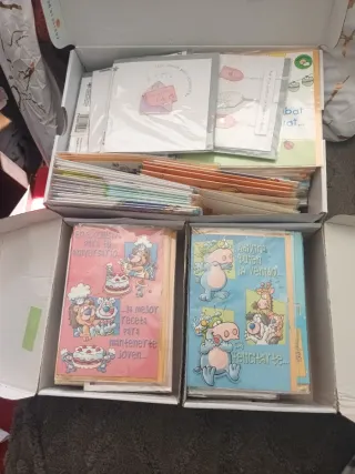 Conjunto de tarjetas de felicitación para diversas ocasiones. Incluye diseños con animales y mensajes alegres. - Tarjetas con temática de cumpleaños. - Diseños con animales como leones, jirafas e hipopótamos. - Mensajes en español como Feliz Cumpleaños y Felicitarte. - Algunas tarjetas tienen detalles brillantes y coloridos. Tarjeras para bodas para despididas para amigos hay del todo El menos hay como 100 tarjetas