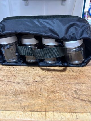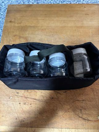 Set de 4 botes de plastico con tapa para especias o condimentos, ideal para llevar en tu bolsa de picnic o camping. Incluye una bolsa organizadora. - Botes de plastico - Tapas de rosca. - Bolsa de tela negra.