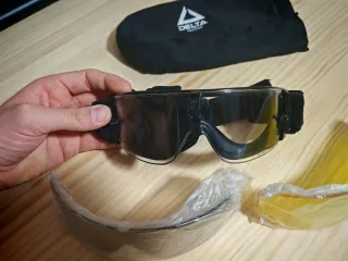 Gafas de ventisca Delta Tactics con lentes intercambiables para airsoft. Incluye funda protectora. Lente transparente con alguna marca, pero no afecta a la visión. Lente oscura y amarilla sin estrenar.