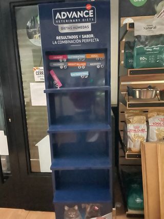 Expositor de la marca Advance Veterinary Diets para dietas húmedas. - Diseño de color azul. - Múltiples compartimentos para productos.