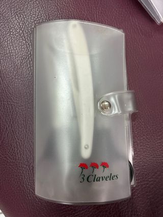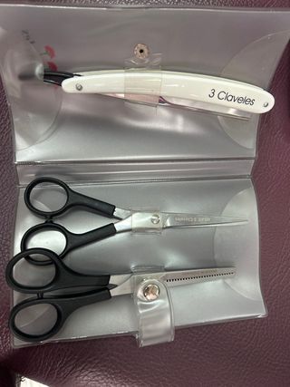 Este set incluye una navaja de barbero y dos pares de tijeras de la marca 3 Claveles. - Navaja de barbero con mango blanco. - Un par de tijeras de corte. - Un par de tijeras de entresacar.