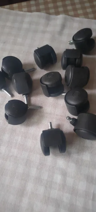 ruedas giratorias negras para sillas de oficina o mobiliario. Tengo 8 de vástago pequeño y nuevas 6 de vástago más largo usadas - Diámetro del vástago: 11 mm. - Longitud del vástago: 22 mm. - Diámetro de la rueda: 50 mm.