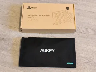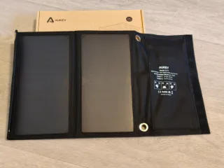 Panel solar plegable de la marca AUKEY, ideal para cargar dispositivos en exteriores. Su diseño compacto lo hace fácil de transportar. Nuevo sin usar. Dispongo de 2 unidades. Precio por unidad. - Potencia: 14W. - Marca: AUKEY. - Diseño plegable. - 2 puertos USB de salida
