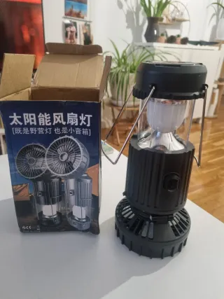 Linterna multifuncional con ventilador integrado y carga solar/USB. Ideal para camper. Está sin estrenar. - Diseño portátil y compacto. - Ideal para camper, camping y actividades al aire libre. - Panel solar para recarga. - Enchufe USB.