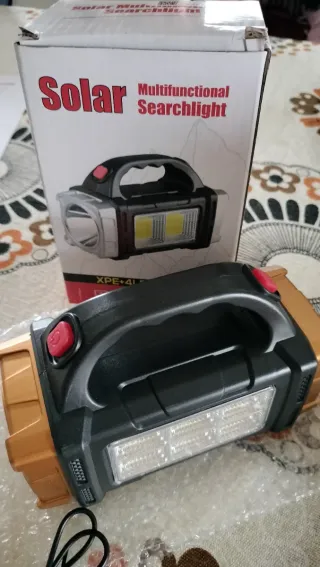 Linterna multifuncional con diseño portátil y acabado en dorado y negro. Ideal para exteriores. - Panel solar para carga. - Asa ergonómica para fácil agarre. - Múltiples paneles LED para iluminación potente. lampara de trabajo exterior. linterna de aventura para acampar. Entrega personalmente en Vigo, Moaña, Cangas o Visum