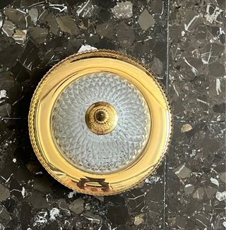 Pequeño plafón de cristal antiguo con detalles dorados. - Diseño clásico y elegante. Muy decorativo. - Materiales de calidad. - Su diámetro es de 15 centímetros sin adornos. - Se hacen envíos.