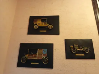 Conjunto de tres plafones en cuero decorativas con motivos de coches antiguos de metal. - Diseño de coches clásicos. - Montadas sobre fondo negro. - Ideales para decoración temática.
