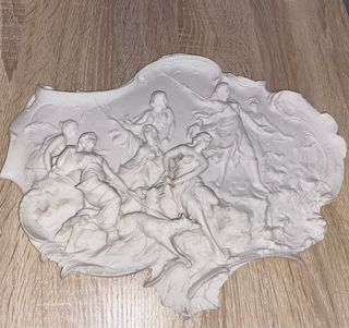 Plafón decorativo de resina con un diseño antiguo y detallado. Con esceza de caza de la diosa Diana de Volkstedt, Alemania, años 20. Medidas: 35 cm de amplio por 26cm de largo. - Representación de figuras mitológicas o históricas. - Relieve tridimensional. - Ideal para decoración de paredes.