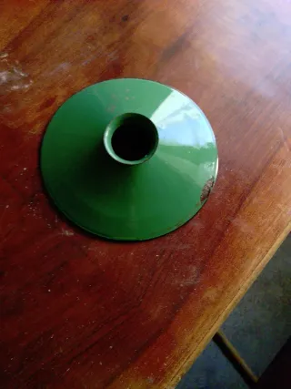 Este es un plafón o plato de lámpara antiguo con un acabado esmaltado en color verde. Su diseño circular y cónico lo hace un elemento decorativo interesante. - Material: Metal. - Color: Verde.