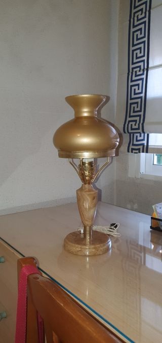 Dos preciosas lamparitas con plafón lacado en oro y la base y columna de marmol imitando un quinqué. Alto 0,37. Ancho del globo 0,17. Base 0,12. Funcionan perfectamente, con su interruptor individual. el precio es unitario; no se venden por separado.
