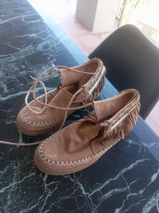 Mocasines de ante en color marrón, con un diseño original. - Detalle de flecos en la parte trasera. - Adorno de abalorios en la tira. - Cordones para ajuste.
