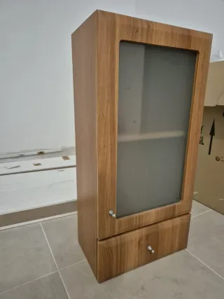 Mueble de baño con un diseño moderno y funcional. - Acabado en madera. - Puerta con cristal translúcido. - Cajón inferior. - Tiradores metálicos.