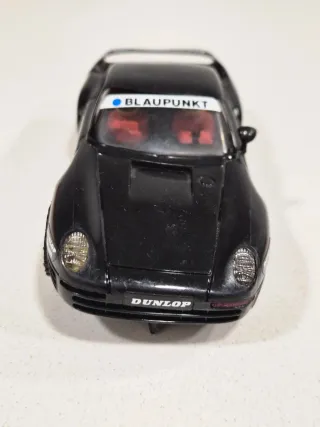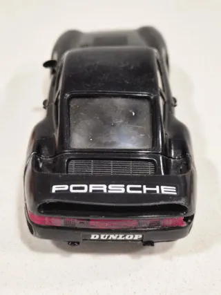 Coche de slot a escala con la marca Porsche. - Color negro. - Detalles de PORSCHE y DUNLOP en la parte trasera.