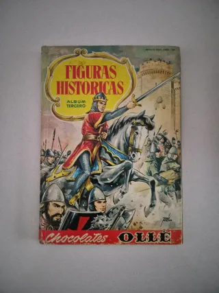 Álbum de cromos Figuras Históricas, tercer volumen. Ilustraciones de batallas medievales y personajes históricos. - Colección completa de cromos. - Portada con un caballero a caballo y soldados. - Incluye el sello de Chocolates OLE. - Dibujo de Toni en la parte inferior derecha. - Solo falta un trozo de la tapa donde no hay ningún cromo
