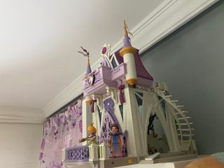 Este es un castillo de juguete de Playmobil con temática de princesas. Incluye figuras y accesorios. - Castillo de color lila y blanco. - Puertas decoradas con motivos florales. - Figuras de princesas con coronas.