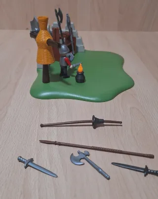 Set de accesorios para un castillo medieval de Playmobil. Incluye figuras y armas. - Figura de caballero con armadura y escudo. - Figura de espantapájaros. - Soporte para armas con hacha y lanza. - Varias armas sueltas: espada, lanza y daga. NO HAGO ENVÍOS X LA EMPRESA GLS. NO RESERVÓ.