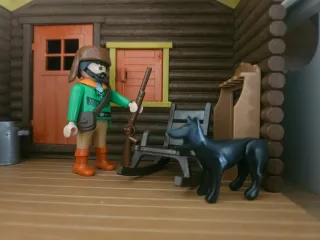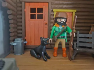 Conjunto de Playmobil que incluye un castillo y una casa. Todo 4€ - Castillo con celda y detalles de lobo. - Casa con estructura verde y interior detallado. - Accesorios como llaves y portal mágico.