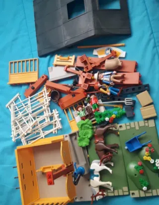 Conjunto PLAYMOBIL Caballos Granja, usado pero en buen estado. Incluye varias piezas para construir una granja, establos y accesorios. Ideal para jugar y coleccionar. - Incluye piezas para construir una granja. - Varios establos para caballos. - Numerosos accesorios para el juego. No lo he montado en su totalidad. Todas las piezas existentes aparecen en las fotos. Son mas de 300 piezas mas el Autobús
