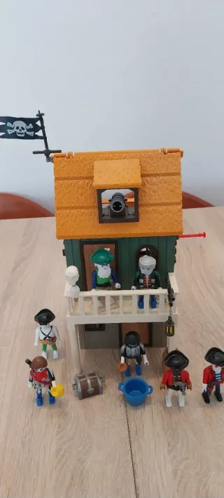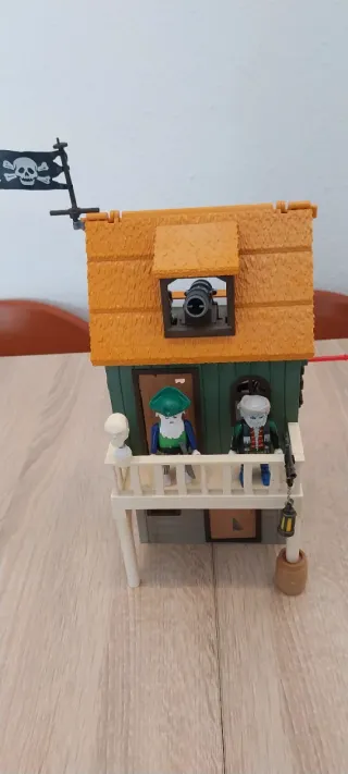 Set de Playmobil de temática pirata, ideal para recrear aventuras en alta mar. Incluye una casa con detalles y figuras. - Casa de dos niveles con tejado naranja. - Bandera pirata con calavera. - Cañón en la ventana superior. - Varias figuras de piratas. - Accesorios como cofre y cubo.