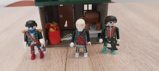 Set de Playmobil con una casa pirata temática. Incluye accesorios y figuras para recrear aventuras. - Casa con tejado de paja y detalles de madera. - Cañón funcional en la parte superior. - Dos figuras de piratas. - Bandera pirata con calavera.hay cuatro figuras